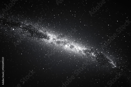 A black and white image of the Milky Way galaxy stretching across a night sky filled with stars