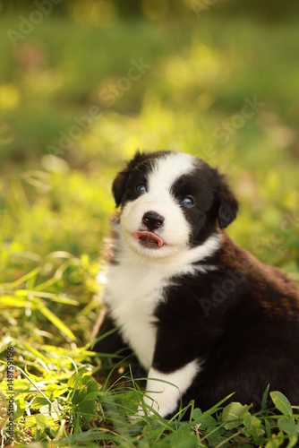 A black and white puppy is sitting in the grass