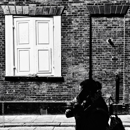 A black and white street image of a woman walking and taking on her mobile phone past a historic old house. Hull old town, UK