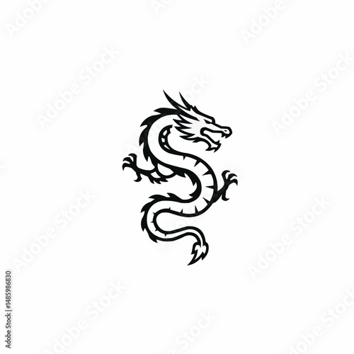 A black and white stylized illustration of a dragon with curved, dynamic linework