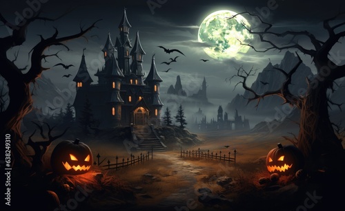 a black castle in the night with pumpkins in the yard near a full moon, in the style background