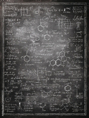 A black chalkboard filled with intricate chemistry equations, molecular structures, and scientific diagrams, used as a teaching tool in a classroom.