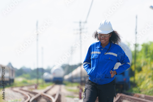 A black female engineer walks the tracks inspecting the readiness of a gas-powered train.