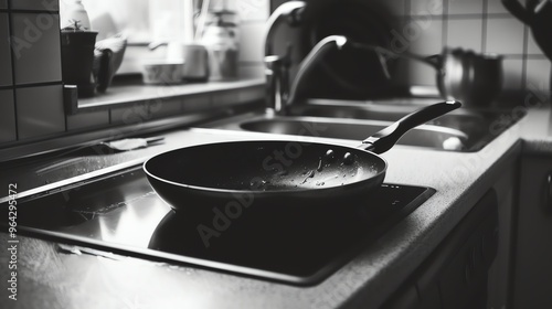 A black frying pan sits on a stovetop in a kitchen.
