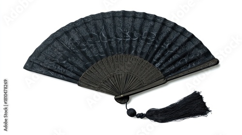 A black hand fan with an intricate, dark grey patterned silk fabric, dark wooden ribs, and a black silk tassel. The fan is slightly open, showcasing the detailed design and craftsmanship