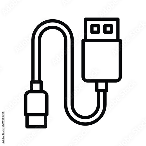 A black outline illustration of a USB cable featuring a standard Atype connector on one end and a smaller Btype connector on the other. Editable stroke. Vector illustration