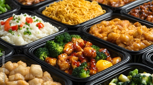 A black plastic food container filled with chicken balls, rice, and vegetables is seen in the middle of an array of other healthy meal boxes