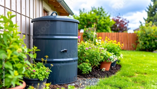 A black rain barrel collecting rainwater in a beautiful backyard garden, promoting ecological water usage.