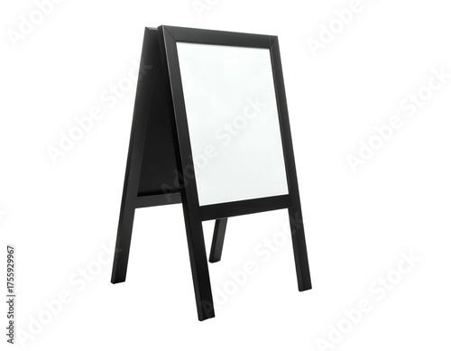 A black, rectangular signboard, with a blank white display, stands on a dark backdrop