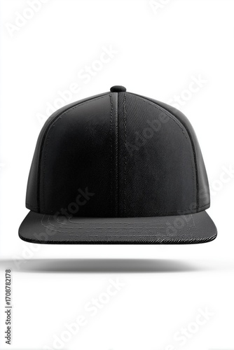A black snapback cap mockup with a flat brim, displayed against a white background