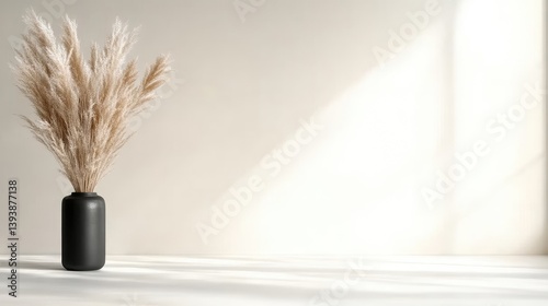 A black vase with dried pampas grass on a white surface, soft natural light streaming from the side, and minimalist interior decor concept.