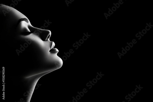 A black-and-white profile of a woman face with a classic Hollywood style, featuring dramatic lighting and shadows