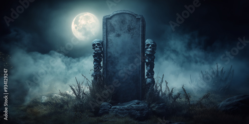 A blank gravestone stands in a foggy, moonlit cemetery, surrounded by eerie skulls and glowing jack-o'-customizable Halloween sign - gothic tomb