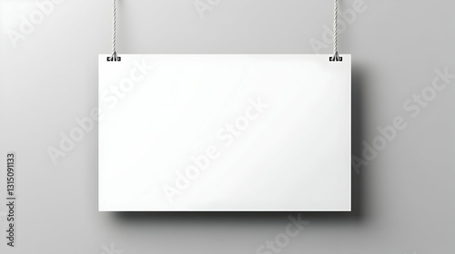 A Blank White Poster Hanging From Strings Against A Neutral Grey Wall Providing Ample Copy Space For Design Or Presentation