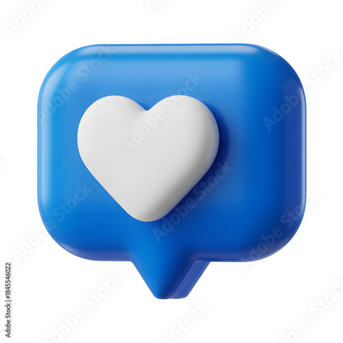 A blue 3d notification bubble with a white heart icon inside for social media likes