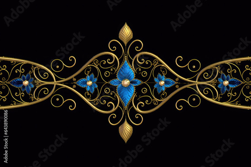 A blue and gold background with a border with gold and turquoise beads, Generative AI