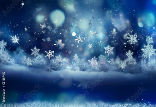 A blue and white winter wonderland with a snowy foreground and a swirling sky filled with snowflakes.