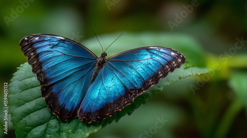 A blue butterfly is sitting on a leaf