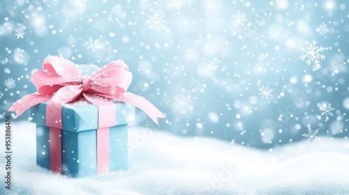 A blue gift box with a pink ribbon in a snowy, winter setting with snowflakes falling.