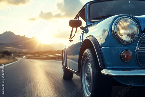 A blue mini car is driving down a road with mountains in the background.