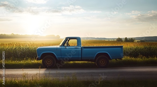 A blue pickup truck is parked on a country road surrounded by a field of crops under the soft warm lighting of the morning sun