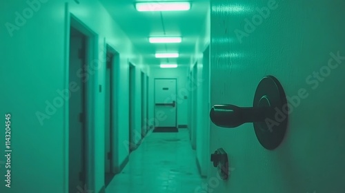 A blue-lighted corridor that features a digital door lock, demonstrating contemporary security solutions.
