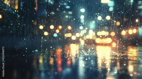 A blurred cityscape at night with rain falling, creating a bokeh effect with glowing streetlights and reflections on the wet pavement, evoking a cozy and atmospheric scene