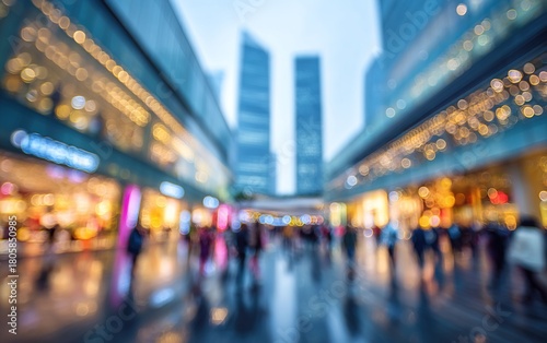A blurry abstract view of a shopping mall in Shenzhen, China, with skyscrapers and a bokeh background. High quality. High quality