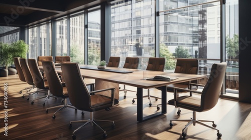 A boardroom with a long table and ergonomic chairs