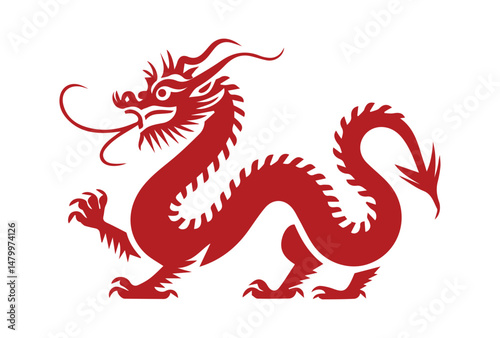 A bold, stylized silhouette of a Chinese dragon in deep red against a white background.