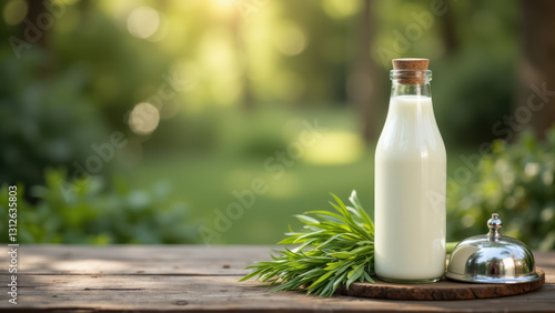 A bottle of fresh milk on a rustic wooden table with herbs in the background, set against a serene forest backdrop.