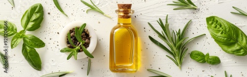 A bottle of olive oil is in the center of the image, surrounded by vibrant green basil leaves
