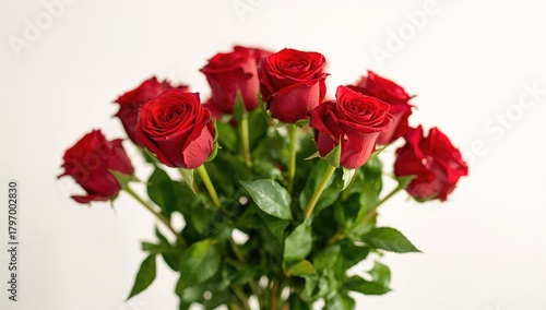 A bouquet of red roses, with vibrant blooms in clear detail against a soft white background, emphasizing floral beauty