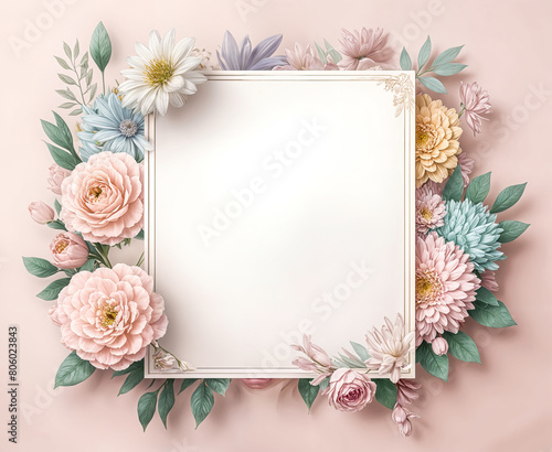 A bouquet of white, pink, and orange flowers in a vase next to a blank white canvas