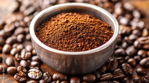 A bowl of coffee beans and coffee grounds