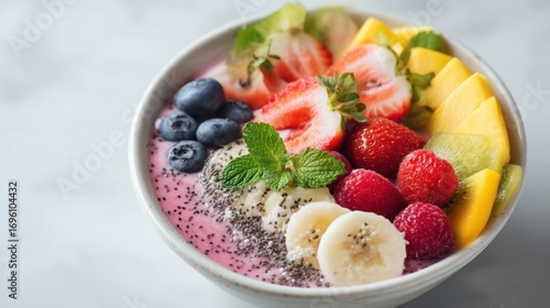 A bowl of colorful smoothie topped with fresh strawberries, blueberries, raspberries, banana slices, kiwi, and mint leaves. Healthy breakfast concept.