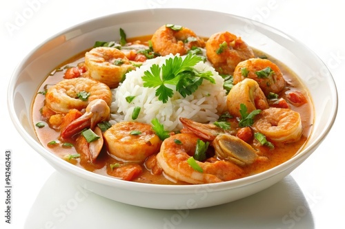 A bowl of flavorful shrimp curry, cooked to perfection with fresh ingredients, served with a side of fluffy white rice. The dish is a symbol of deliciousness, comfort food, cultural cuisine, culinary