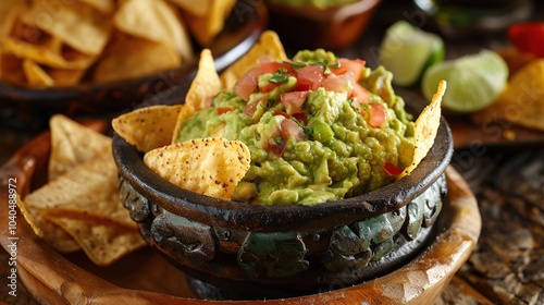 A bowl of fresh guacamole with a basket of crispy tortilla chips
