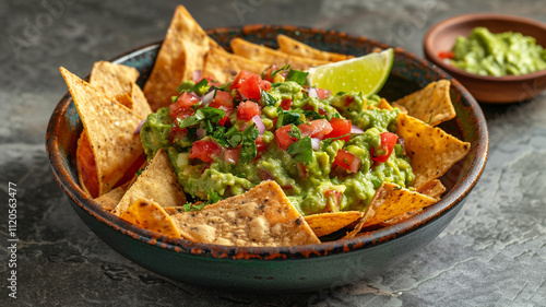 A bowl of fresh homemade guacamole served with crispy tortilla chips