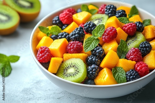 A bowl of fruit salad with kiwi, blackberries, and mango