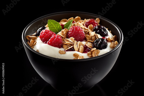 A bowl of granola with yogurt and berries on a black background. AI generation.