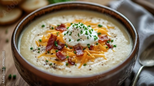 A bowl of loaded potato soup, topped with shredded cheese, bacon, and a dollop of sour cream, with a sprinkle of chives.