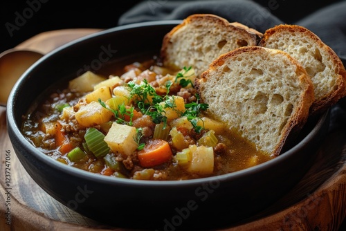 A bowl of soup with a piece of bread on the side. The soup is full of vegetables and meat, and the bread is to the side