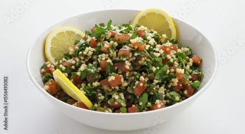 A bowl of tabbouleh salad with tomatoes parsley and lemon wedges on a white background surface