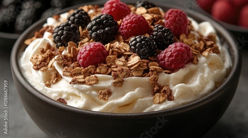 A bowl of yogurt topped with granola and fresh berries, symbolizing a healthy and balanced breakfast.