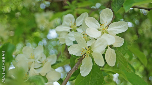 A branch of an apple tree with delicate white flowers and a yellow center on a tree on a spring sunny day