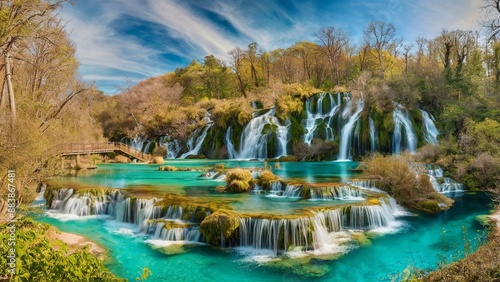 A breathtaking aerial view of Plitvice National Park in Croatia, showcasing the mesmerizing beauty of its cascading waterfalls
