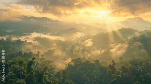 A breathtaking cinematic sunrise over misty mountains and lush tropical forests, showcasing stunning natural beauty, peaceful atmosphere, and dramatic landscape scenery.
