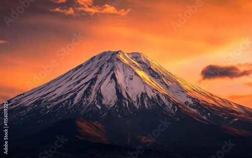 A breathtaking close-up of a snow-capped mountain peak under a vibrant orange sunset, captured with professional clarity and rich tones