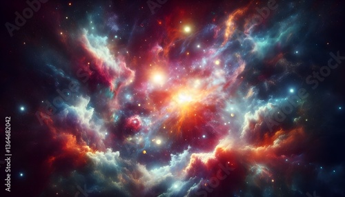 A breathtaking cosmic nebula with swirling clouds of gas and dust, illuminated by bright glowing stars.